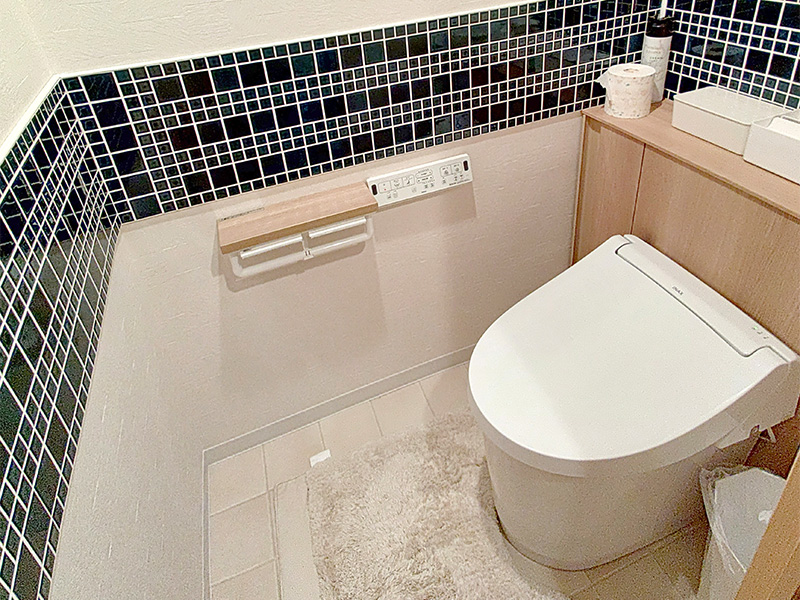 トイレ:LIXIL Jフィット 手洗付き H1グレード(扉色:ライトオーク) タイルシート:LIXIL スマートモザイクシート(品番:SMTS 630/BYA-4) 壁クロス:シンコール SL+(品番:SLP275) 天井クロス:シンコール SL+(品番:SLP211) 床材(クッションフロア):シンコール ポンリューム テラコッタ(品番:E1070) |